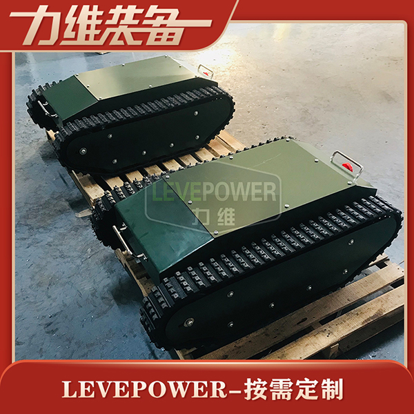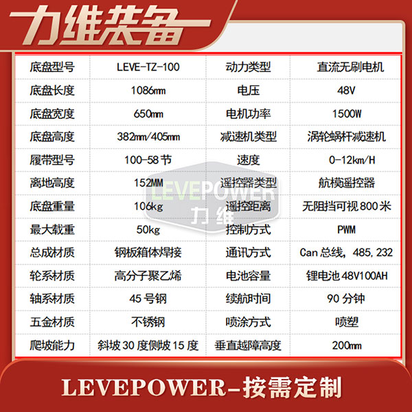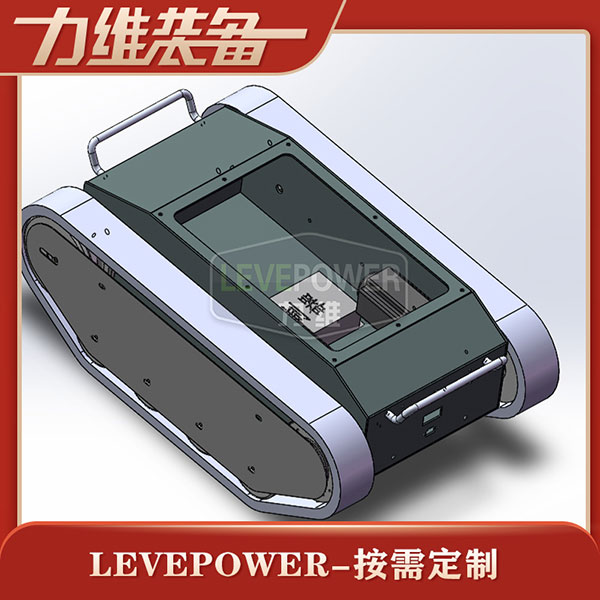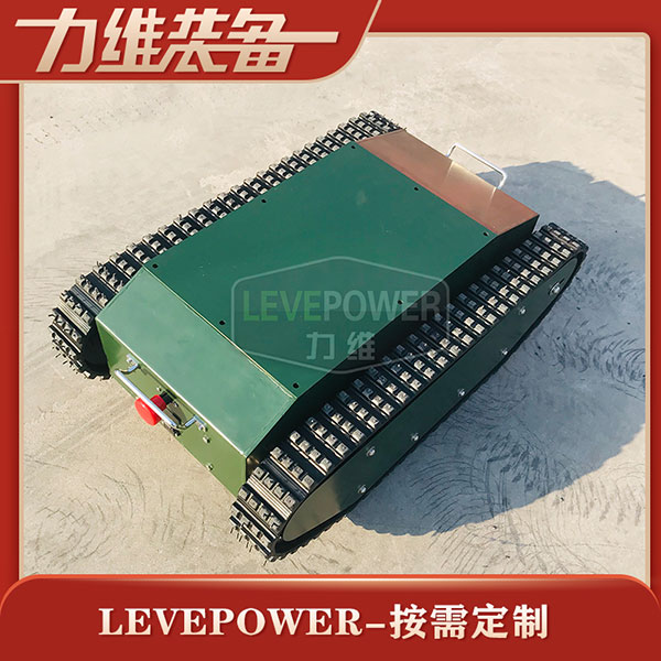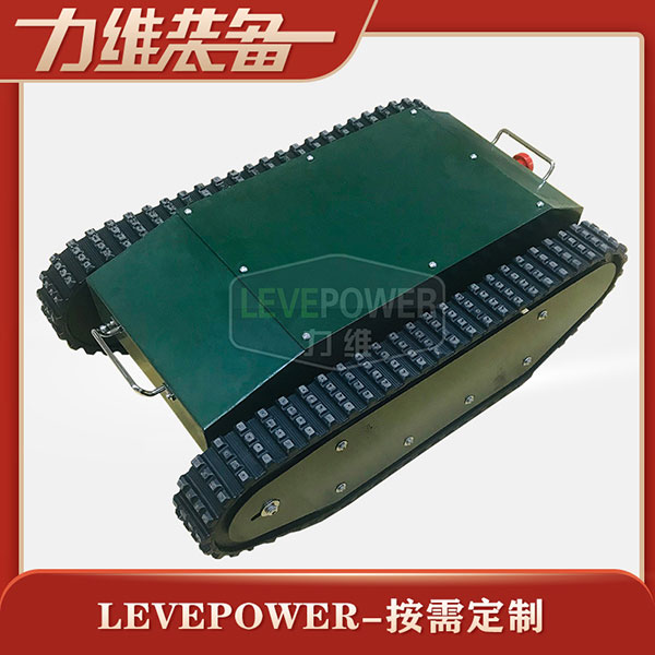特種橡膠履帶底盤長1086mm,履帶底盤寬650mm,履帶底盤高382mm,無線遙履帶底盤搭載48V350W直流無刷永磁電機,RV50渦輪蝸桿減速機,動力更強。履帶底盤采用48V50AH鋰電池,續(xù)航時間更長。履帶底盤框架采用鋼板箱體焊接而成,底盤承載力大,是一款全地形履帶底盤。