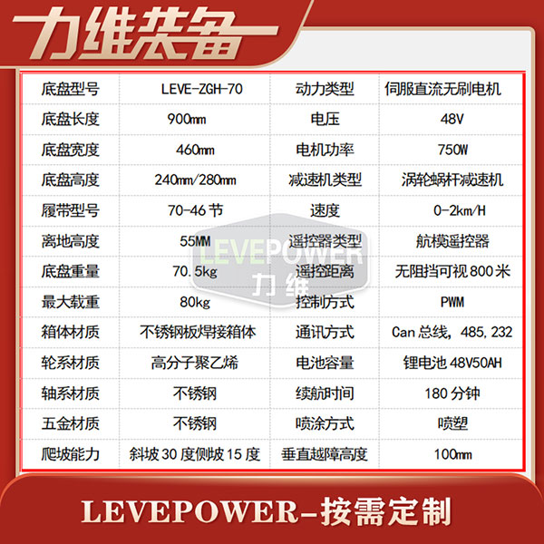 履帶底盤長(zhǎng)900mm,履帶底盤寬460mm,履帶底盤高280mm,無線遙控履帶底盤箱體采用鋁合金材質(zhì)焊接而成,防腐性能好。履帶底盤動(dòng)力采用48V750W直流無刷電機(jī),渦輪蝸桿減速機(jī)動(dòng)力更強(qiáng),轉(zhuǎn)彎靈活。履帶底盤電池采用48V20AH鋰電池,續(xù)航時(shí)間更長(zhǎng),是一款不錯(cuò)的機(jī)器人橡膠履帶。