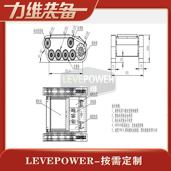 履帶底盤長(zhǎng)700mm,履帶底盤寬500mm,履帶底盤高255mm,無(wú)線遙控履帶底盤箱體采用鋁合金材質(zhì)焊接而成,防腐性能好。履帶底盤動(dòng)力采用48V500W直流無(wú)刷電機(jī),渦輪蝸桿減速機(jī)動(dòng)力更強(qiáng),轉(zhuǎn)彎靈活,爬坡性能穩(wěn)定。履帶底盤電池采用48V50AH鋰電池,續(xù)航時(shí)間更長(zhǎng),是一款不錯(cuò)的機(jī)器人橡膠履帶。